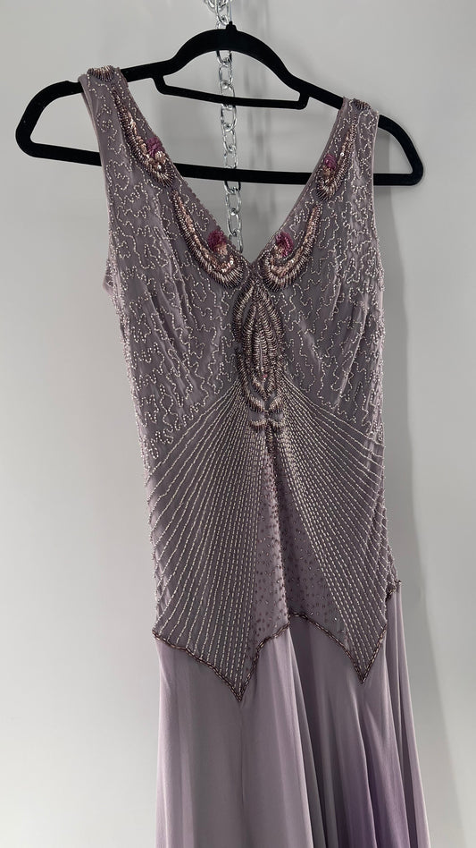 Vintage SCALA Navy Blue Beaded Floor Length Gown with Plunging Neckline, Backless Detail, and Tan Underlay (C)(4)