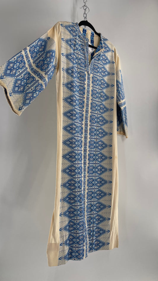 Vintage Pericles 1970s Wool Blend Off White Tunic Gown with Blue Needlepoint Embroidery