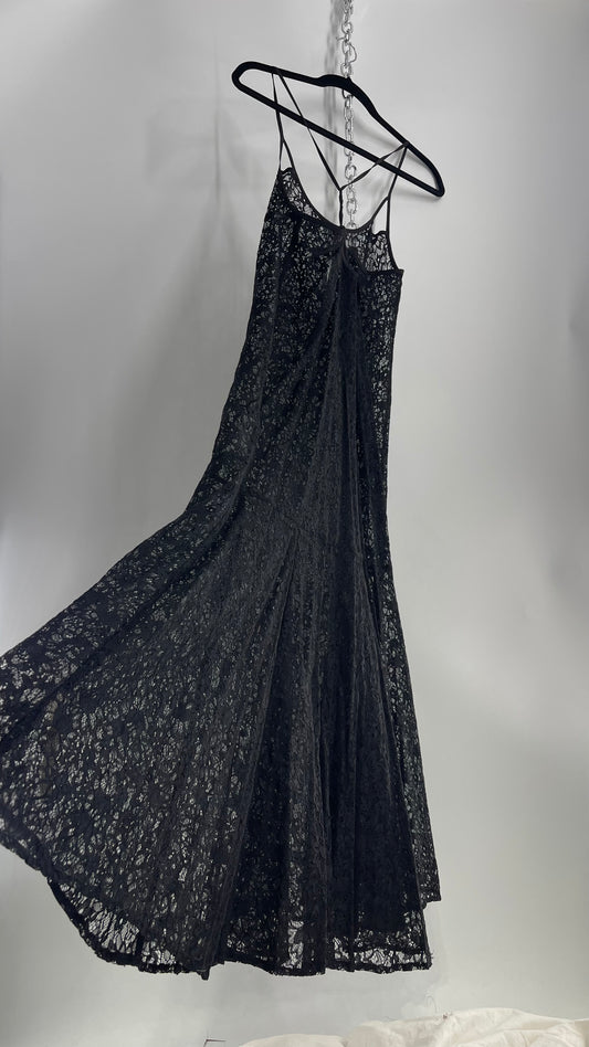 Free People Sabina Black Sheer Crimped Lace Long Sleeve Maxi with Ruched Slit (XS)