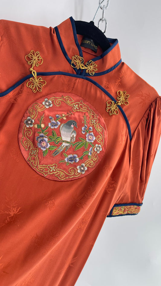 Rare Vintage JENNY LEWIS 1980s 100% Silk, Handmade Gown with Needlepoint Embroidered Bust Decal