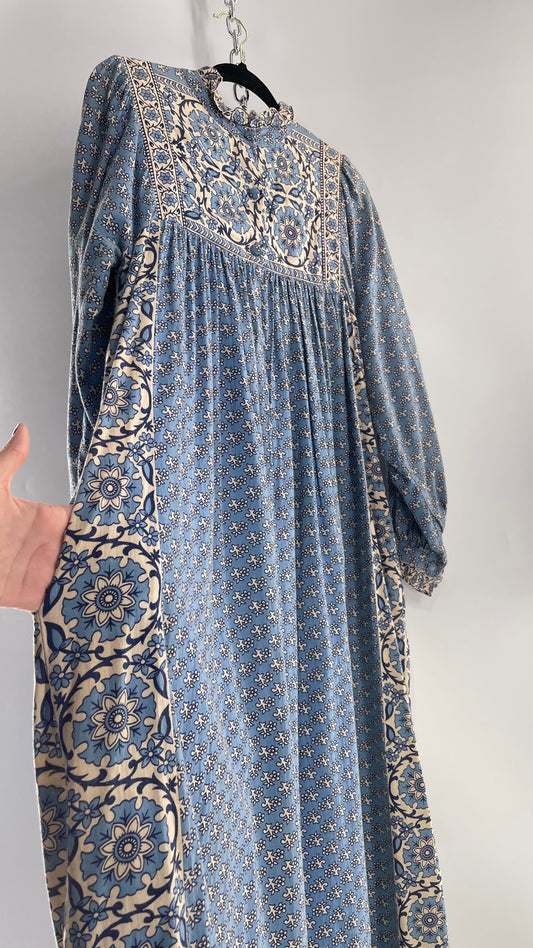 Vintage 1970s Ramona Rull 100% Cotton Powder Blue Mixed Quilted Pattern Gown with Pockets (Large)