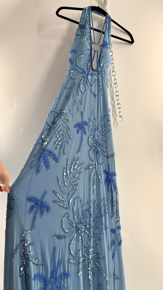 Vintage 1990s Powder Blue Gown Covered in Beaded Appliqué Tropical Designs with Strappy Bust and Low, Open Back (S/M, stretchy no size marked)