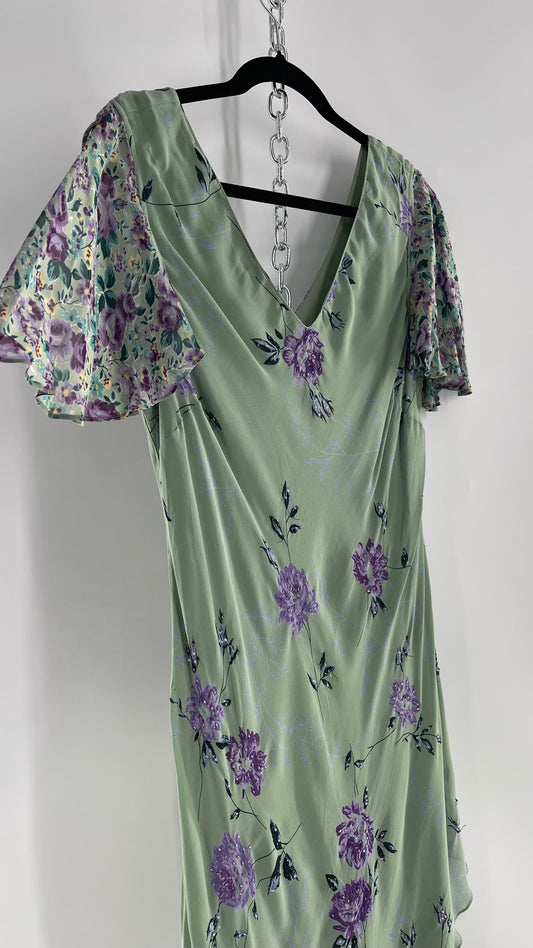 Vintage 1990s EVA BLUE Sage Green Dress with Purple Beaded Florals and Handkerchief Hem(16)