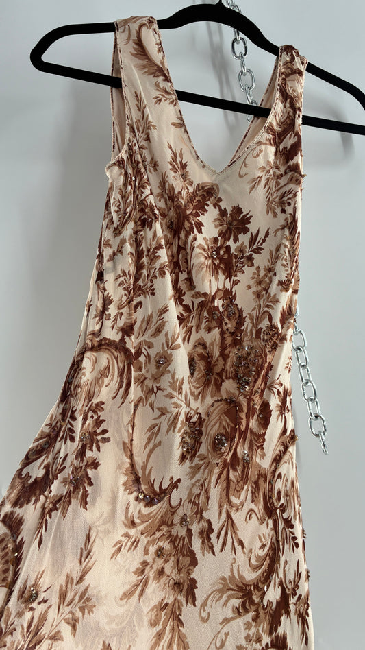Vintage MAJICK 1990s Brown Floral, Asymmetric Ruffled Hem Gown with Embroidered Sequin Details (Medium)