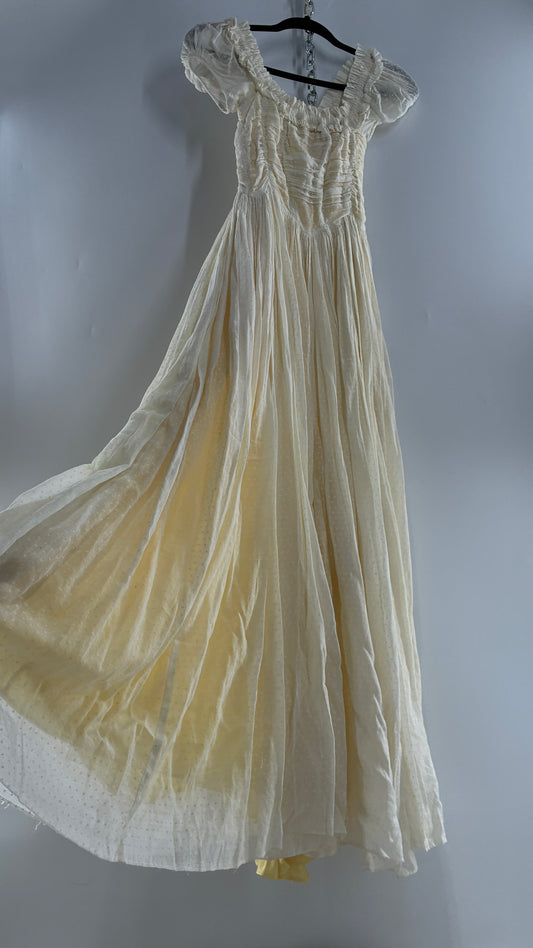 Vintage 1970s Off White Cotton Handmade Maxi Dress with Ruched Bodice, Puff Sleeves, and Polka Dot Texture (XS/S)