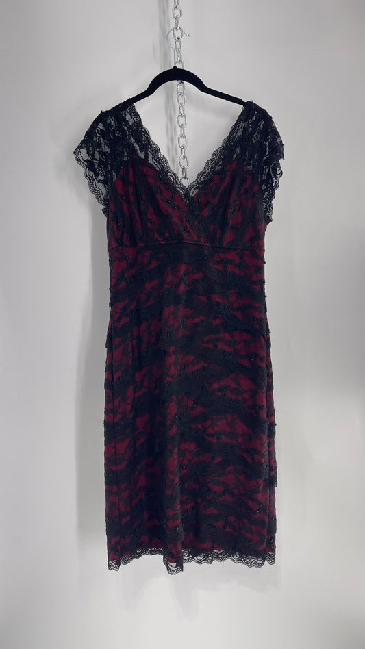 Vintage Marina Vampira Mídi Dress with Beading and Scalloped Black Lace Over Red Underlay (12) (Consigned)