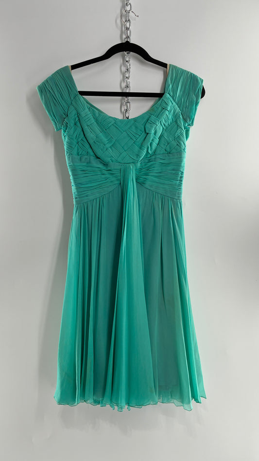 Vintage Teal Handmade Mini Dress with Pleated Basket Woven Bust (XS)