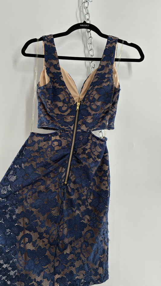 EMERALD SUNDAE Navy Blue Lace Cut Out Mini Dress with Built in Bra (Small)