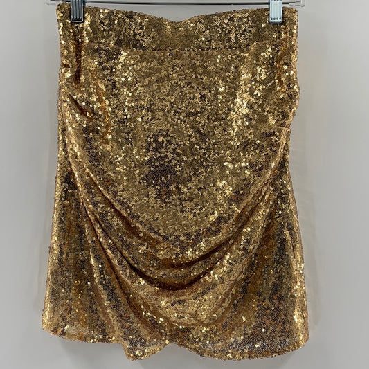 Free People Sparkly Gold Sequin Mini Skirt Ruched Side (Size Medium)