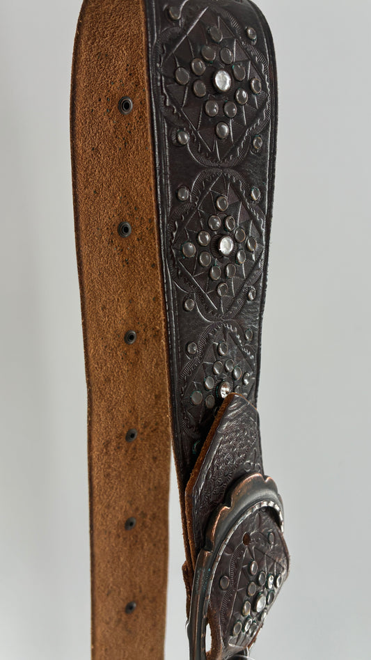 Vintage Abercrombie & Fitch Brown Leather Embossed Belt with Rhinestone Details (Small)