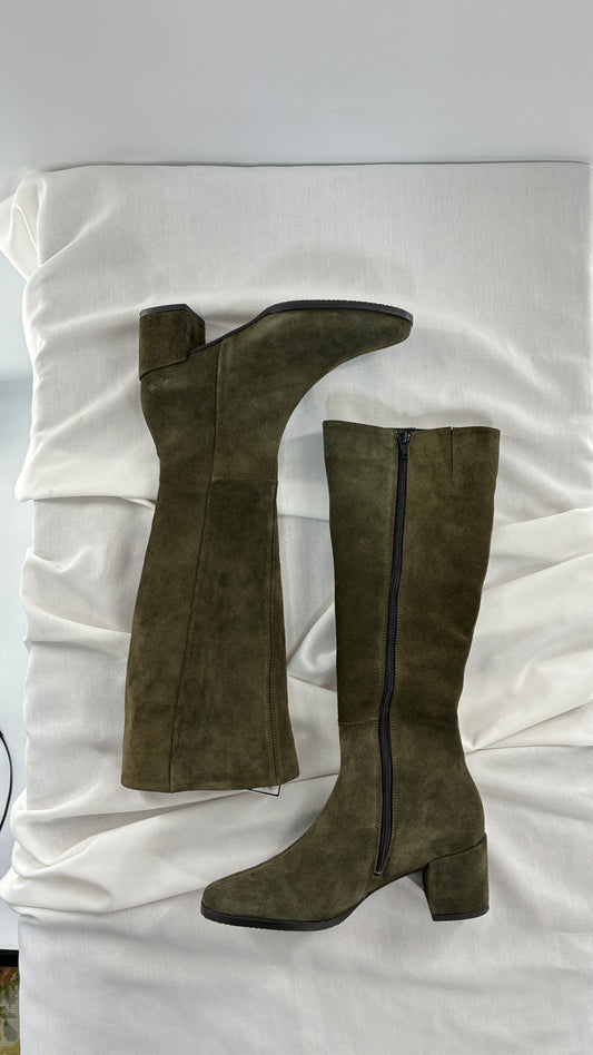 Vintage ERIC MICHAEL Olive Green Suede Boots Square Toe Knee High Boots (36)