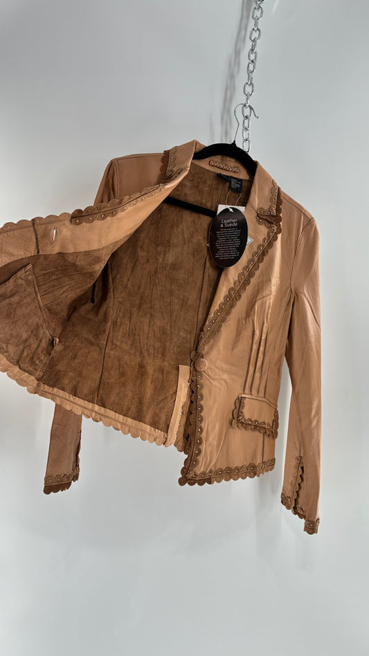 RARE Deadstock Vintage Cami Brown Thin Leather Jacket with Suede Scalloped Trim (12)