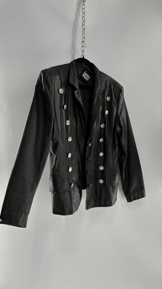 Vintage Virginia Slims Black Genuine Leather Military Jacket with Double Breasted Embossed Buttons (Large)