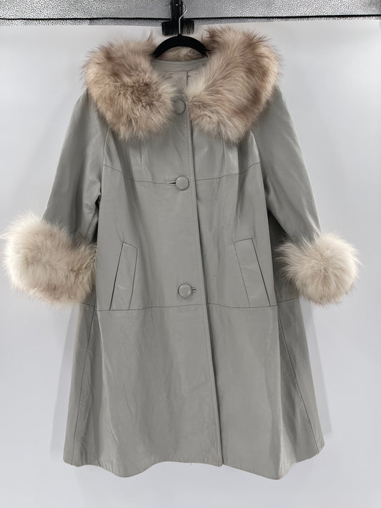 Light Gray 100% Leather Coat With Real Fur Collar and Cuffs Trim (Size 16) VINTAGE