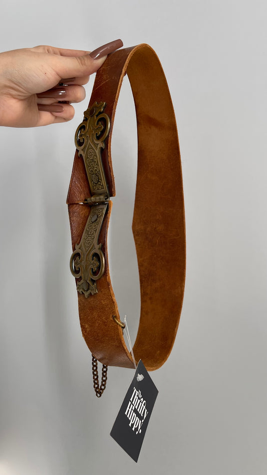 Vintage Antique Leather Waist Belt with Engraved Brass Brackets and Pin Closure (XS/S)