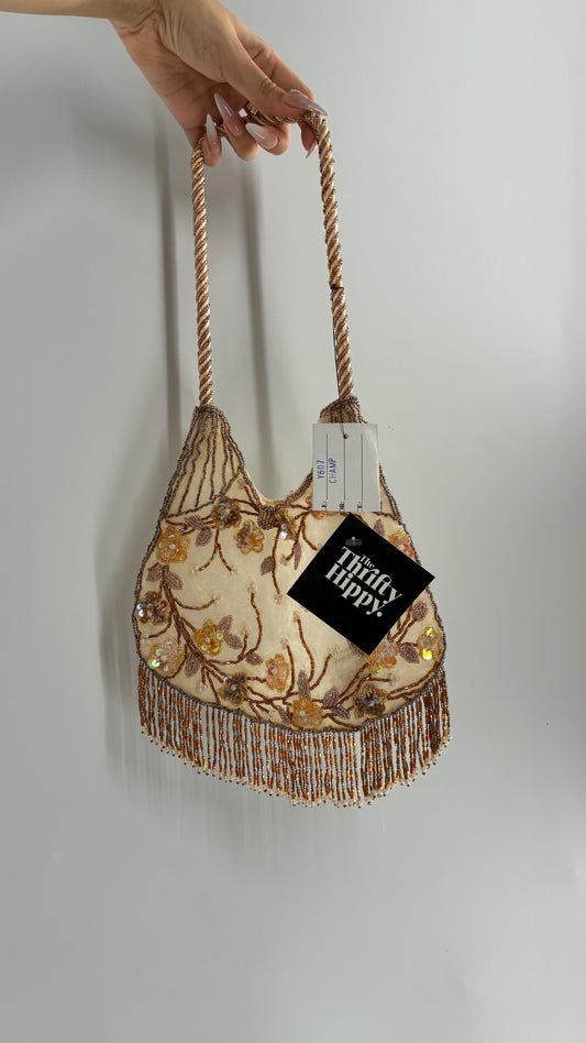 Vintage Deadstock Beige Beaded Fringe Purse with Embroidered Beaded Florals