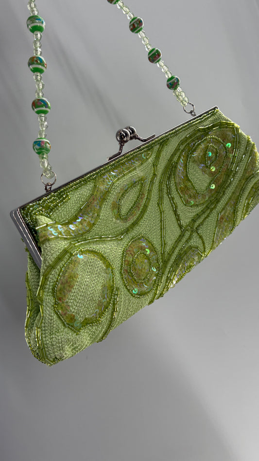 Vintage 1990s Light Green Knit Shoulder Purse with Sequins and Beaded Details