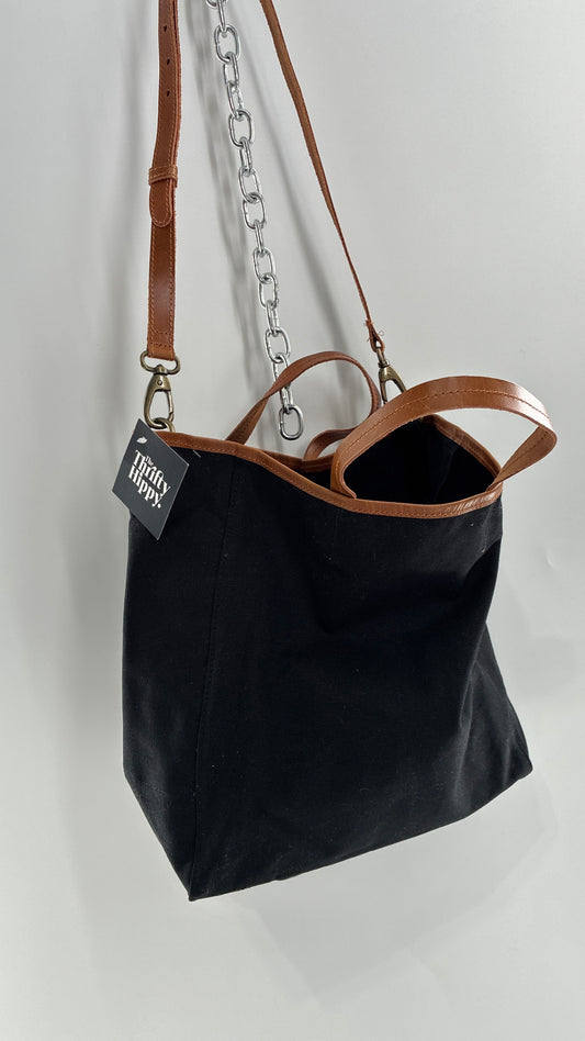 Urban Outfitters Large Black Cotton Tote Bag with Inner Pockets, Genuine Leather Lining and Straps