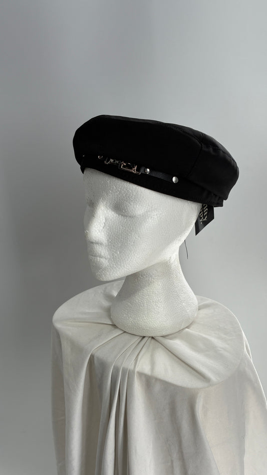 Black Beret with Vegan Leather Strap with Silver Metal Hardware