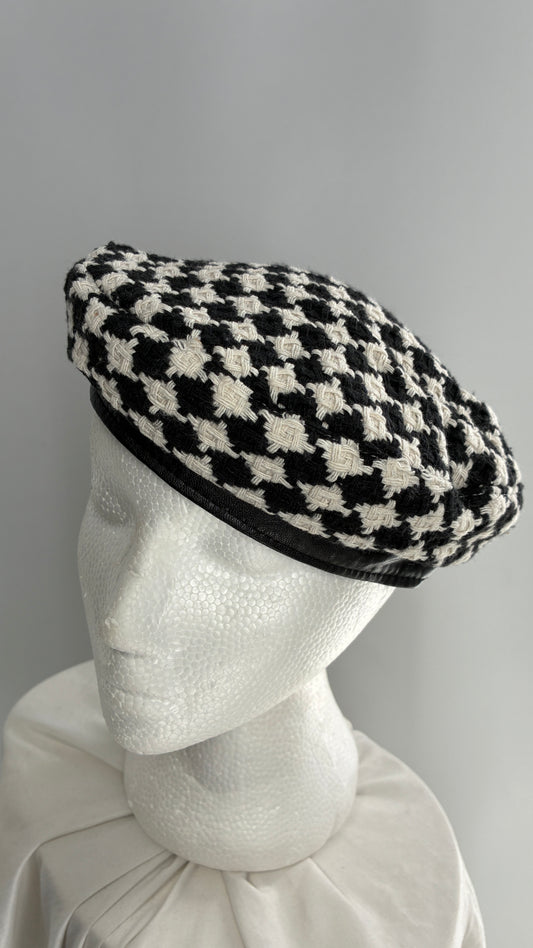 Black and White Knit Houndstooth Beret with Vegan Leather Band