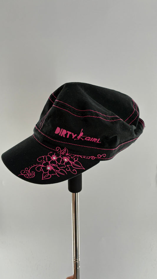 Vintage DIRTY GIRL Black Band Hat with Hot Pink Florals and Contrast Stitching