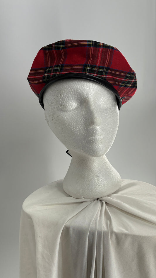 Red Plaid Beret with Vegan Leather Strap with Silver Metal Hardware