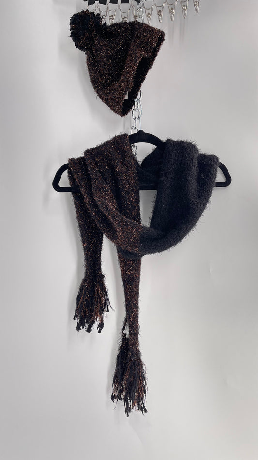 Anthropologie Bronze Tinsel Black Knit Beanie and Skinny Pom Scarf 2pc Set with Tags Attached