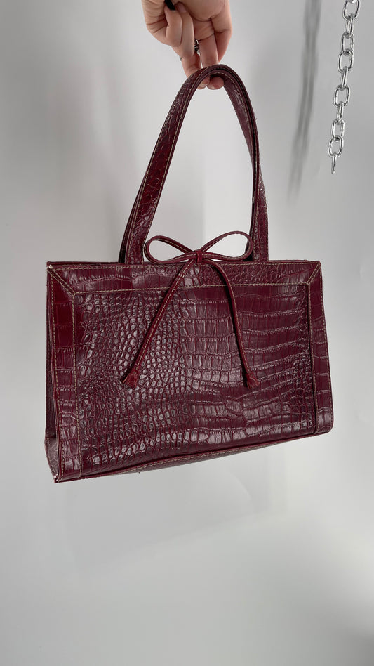 Vintage Liz Claiborne 1990s Cherry Red Crocodile Embossed Structured Bow Bag