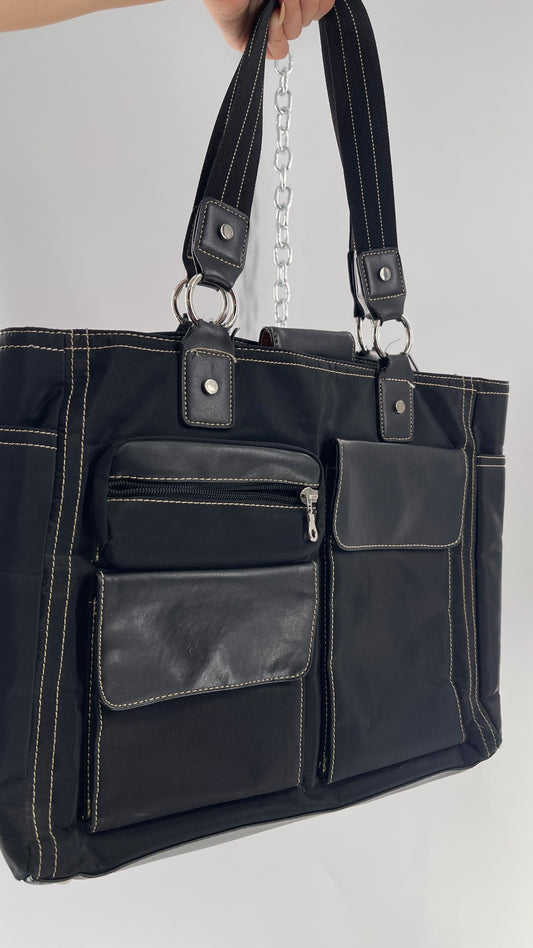 Vintage Oversized Black Exaggerated Pocket Tote Bag with Contrast Stitching