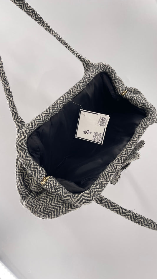 Vintage Wool Knit Black White Purse with Flower Appliqué