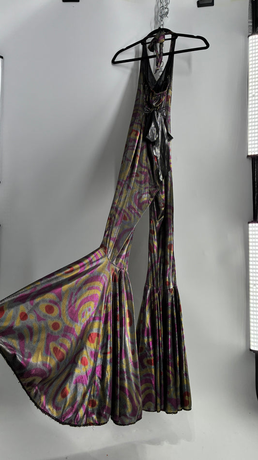 1970s Style Bell Bottom Psychedelic Metallic Jumpsuit with Waist Cinching Back Ties (S/M)