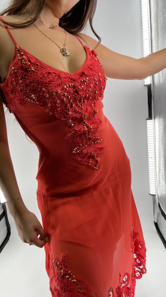 1990s Vintage Cache Coral Appliqué Tropical Beaded Slip (2)