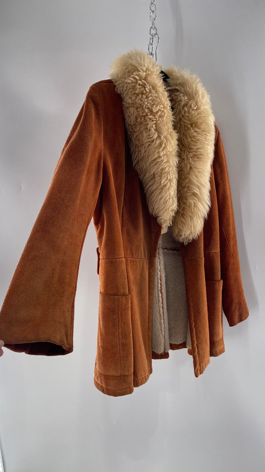 1970s Vintage Burnt Orange Suede Thick Heavy Sherpa Lined Jacket with Genuine Fur Collar (C)(Medium)