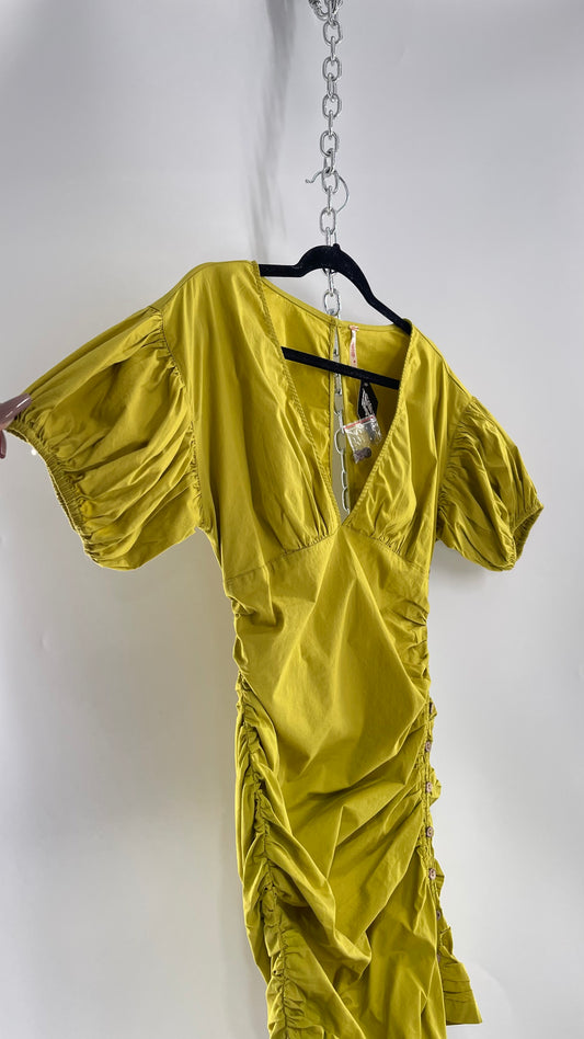 Free People Chartreuse Yellow Green Dress with Ruched Button Up Side (Small)
