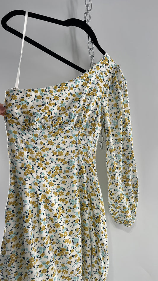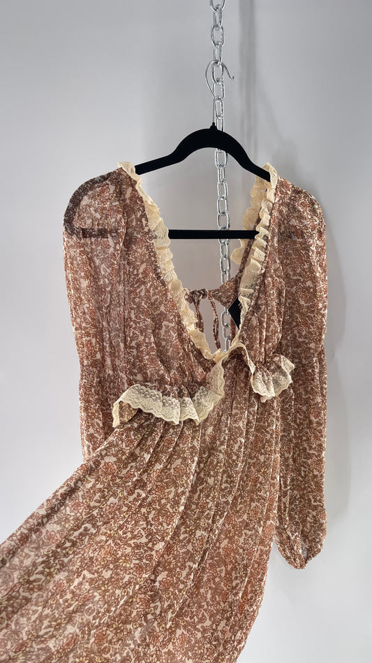 Free People Brown Floral Mini Dress with Beige Lace Lining and Puffy Balloon Sleeves (XS)