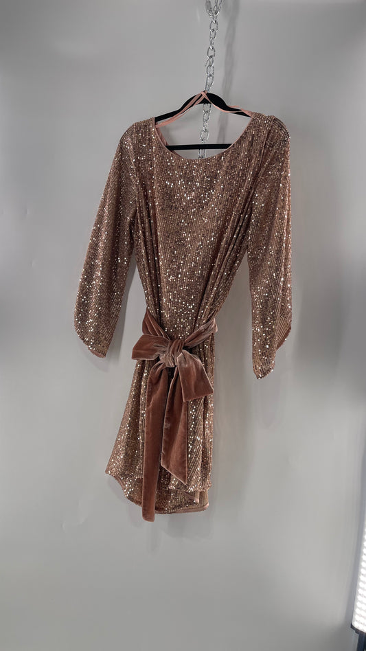 Anthropologie Rose Gold Sequin Dress with Velvet Waist Belt and Tags Attached (XL)