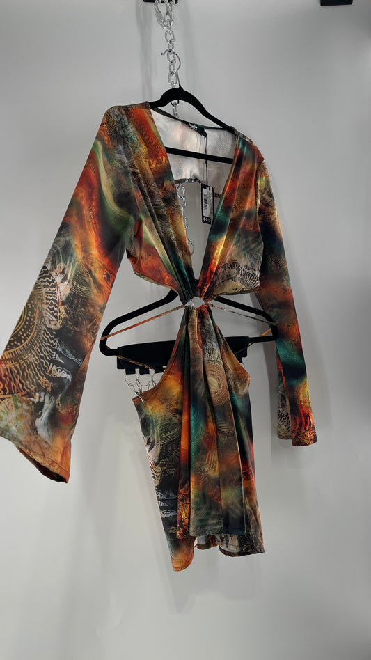 Jaded London Graphic Green, Orange, Yellow Dress with Bell Sleeves, Cut Out Waist and Straps (10)