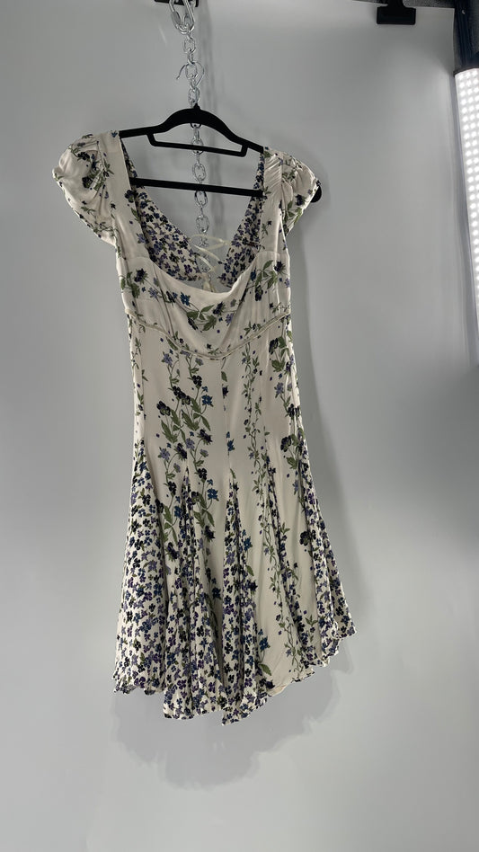 Free People Ivory Mini Dress with Violet Floral Pattern, Cap Sleeves and Lace Up Open Back (M)