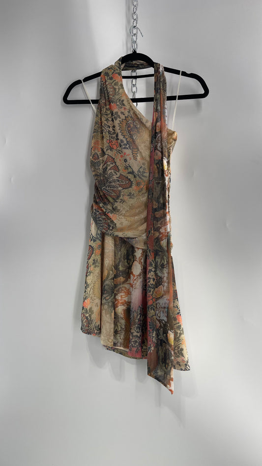 Urban Outfitters All Over 90s Tattoo Graphic Neck Tie Mini Dress with Asymmetric Hem (Medium)