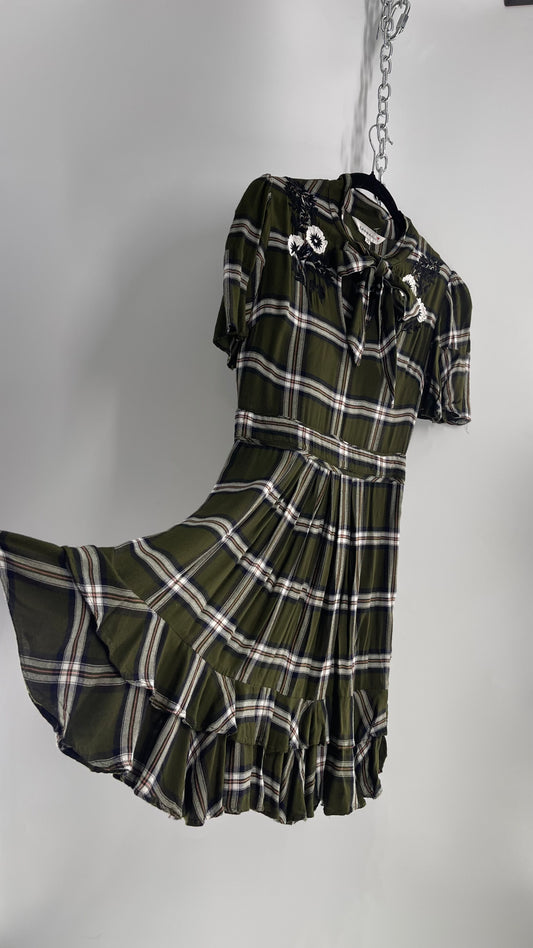 Ranna Gill Anthropologie Army Green Plaid Dress with Floral Embroidery and Bow Tie Detail (XS)