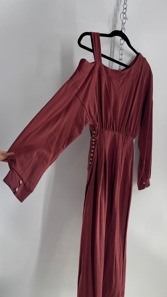 Free People Maroon Bubble Sleeve, Side Button, Off Shoulder Dress (Small)