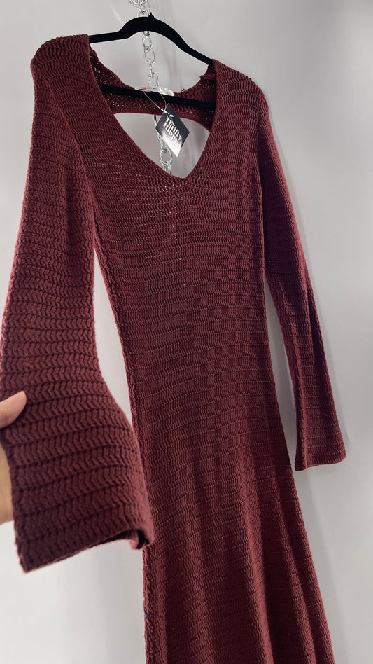Free People Burgundy Knit Long Sleeve Maxi with Open Back (Large)