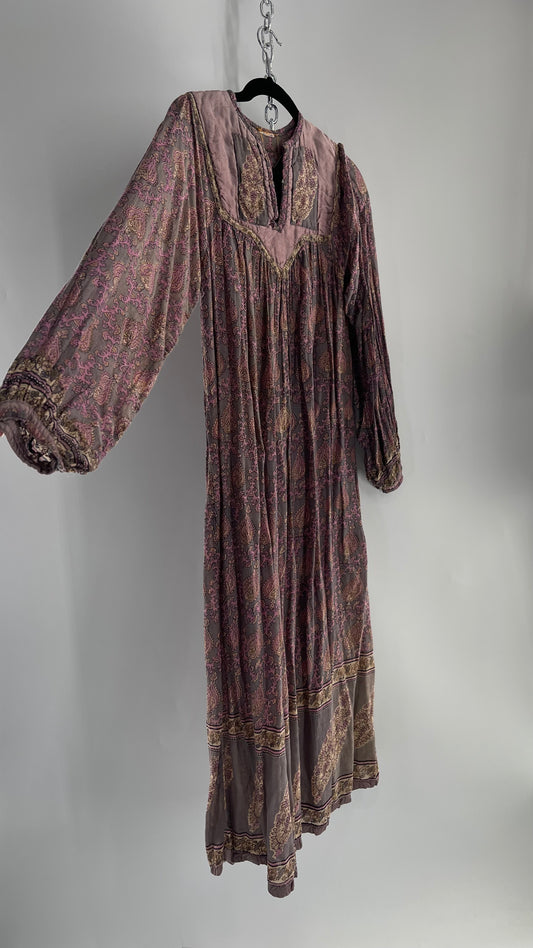 Vintage 1970s Handmade Dusty Purple Full Length Dress with Paisley Pattern and Quilted Neckline (Small)