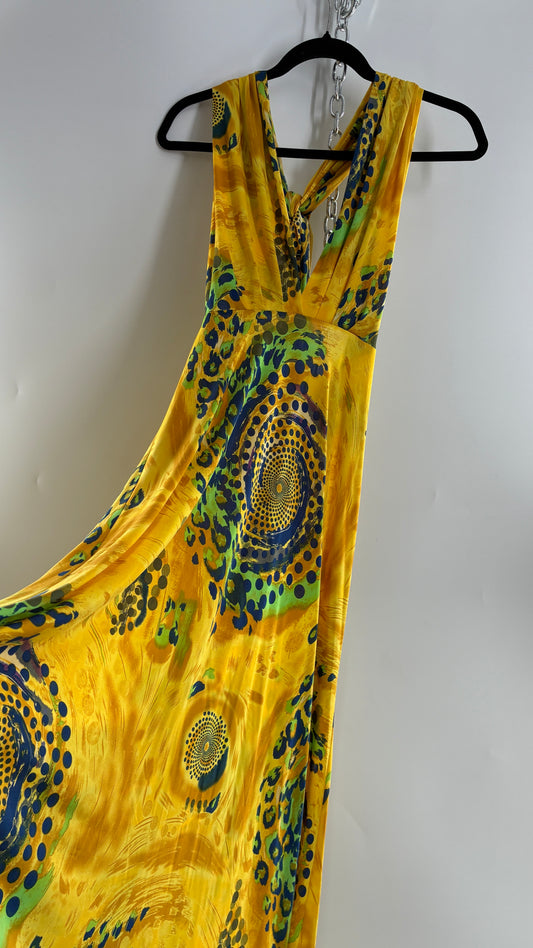 Vintage NARCISA LANG Lycra Full Length, Backless Yellow Dress with Graphic Pattern (XS/S)