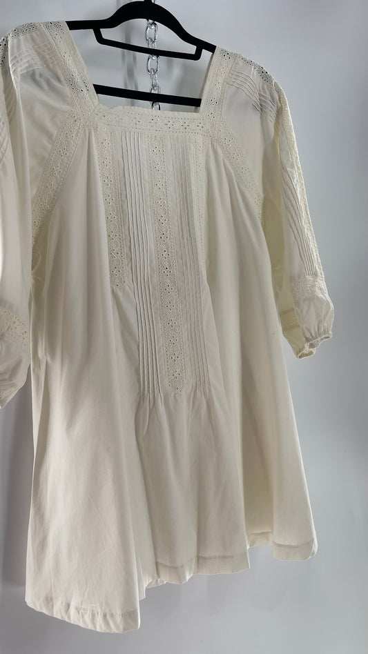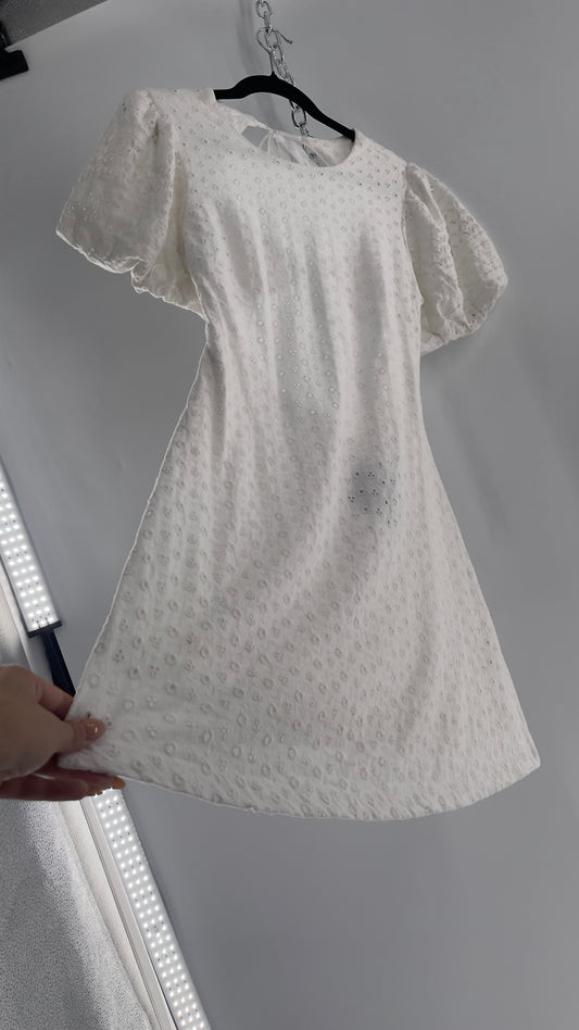 Free People White Eyelet Mini Dress with Puff Sleeve and Open Back (XS)