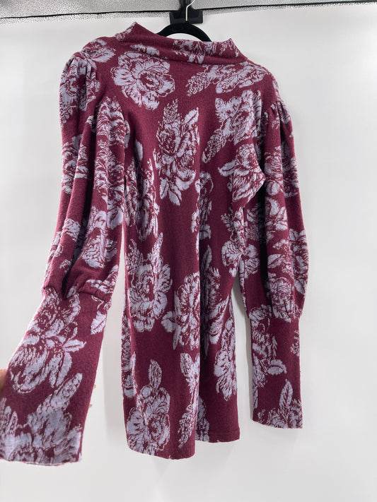 Free People Burgandy Floral Mock Neck Long Sleeve Mini Dress (Size L)