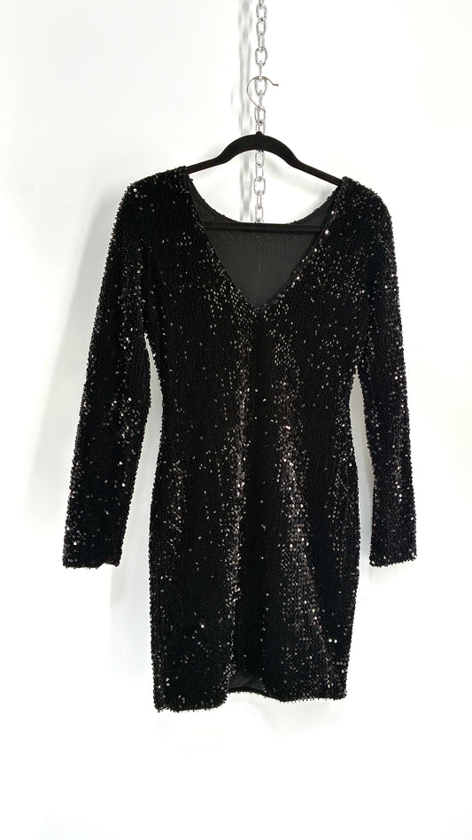 MOTEL Black Thick Velour and Sequin Long Sleeve Bodycon Mini Dress (Medium)