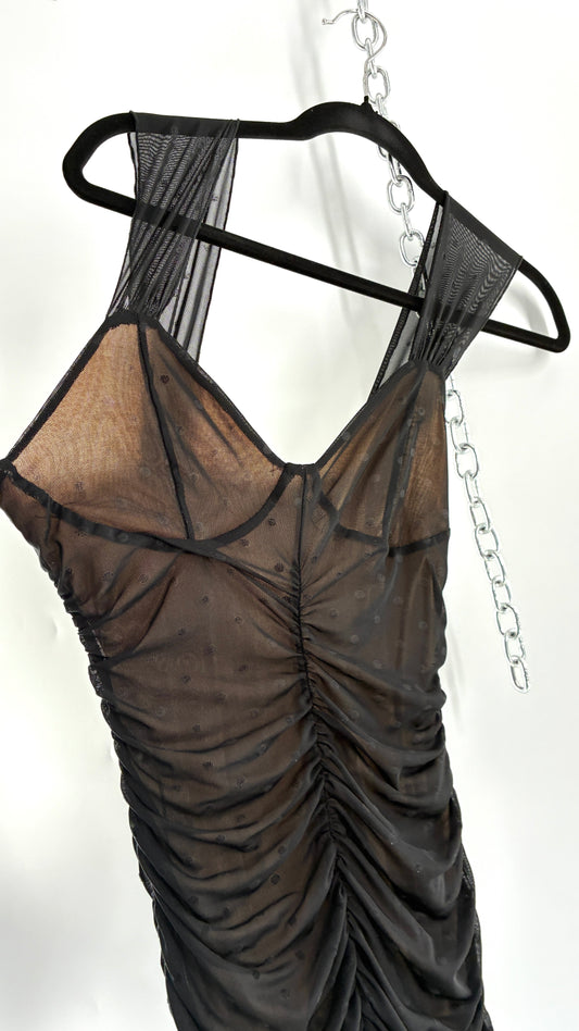 Urban Outfitters Nude Underlay Sheer Black Overlay Polka Dotted and Ruched Bodycon Mini Dress (XS)