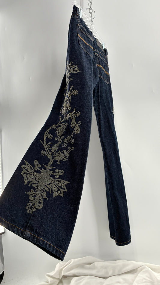 Vintage EXPRESS JEANS Dark Wash with Iridescent, Embellished, Textured Design Running Down Pant Leg (3/4)