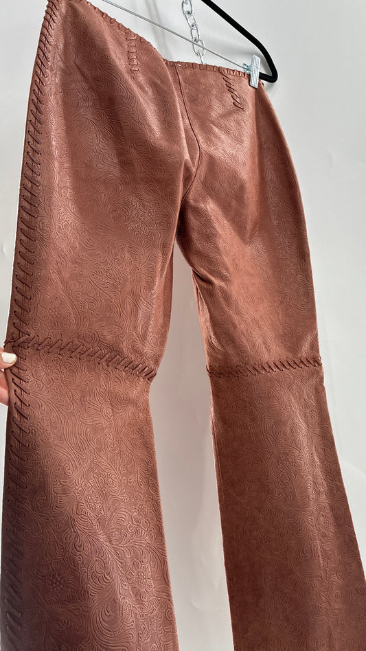 Vintage Embossed Paisley Patterned Genuine Leather Pants with Stitching Details (No Label Unbranded, S)